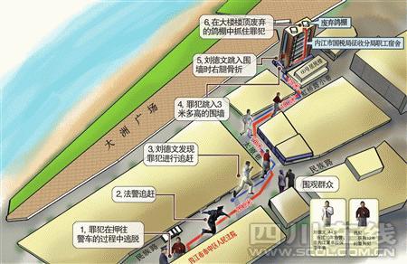 內(nèi)江市中區(qū)人民法院位于鬧市區(qū)的民族路中段,商鋪林立且緊鄰沱江邊的大洲廣場!澳翘煜挛绱蠹s4時40分,我正好沒生意,看見2名法警將4個人從法院押出來,準(zhǔn)備押上停在路邊的警車!遍L年在法院大門斜對面擺煙攤的張氏夫婦,是那天眾多目擊群眾中看得最清楚的人!4個人是在2名法警押送下排隊走出法院大門口的,走在最前面那個小個子沒有戴手銬。剛出法院大門,他趁法警不備將衣服一脫,以飛快的速度沿著街邊人行道直往中醫(yī)院方向飛奔而去。見庭審罪犯脫逃,一名身穿制服的法警,一邊大呼‘站住,不準(zhǔn)跑’,一邊朝那名小伙子緊追而去!