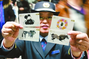 由著名藝術家韓美林設計的北京地鐵首套紀念文化卡票票冊,周六開始在除機場線外的7條地鐵線路各站發(fā)售。地鐵公司表示,本次發(fā)行的單程文化卡票,可于2008年12月6日到2009年3月1日前任意在地鐵運營各線(機場線除外),各站當日使用一次,卡票在出站插卡后,閘機會自動“吐出”紀念卡票,不影響乘客收藏。(記者 韓萌 左林 攝影)