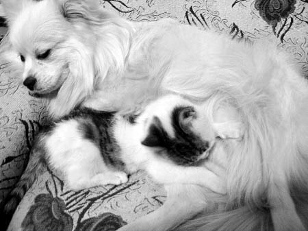 為了能讓小貓健康地活下去,王先生用飲料瓶做了一個(gè)小奶瓶,每天給小貓喂牛奶。而小狗歡歡則充當(dāng)起了“媽媽”的角色。每天晚上都把小貓叼到自己的懷里,摟著它睡覺,小貓則經(jīng)常用小嘴裹著歡歡干癟的奶頭。最近幾天,王先生突然發(fā)現(xiàn)小狗歡歡的乳房變大了,他試著擠了一下,竟然流出乳汁來,小貓也時(shí)不時(shí)湊上去吸幾口。