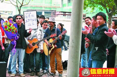 一名男子手持玫瑰花、高舉求愛宣言,并邀來樂隊助陣高唱情歌。昨日上午,珠江新城華利路附近某小區(qū)門口的新奇場面引來眾人圍觀。求愛男子自稱是在網(wǎng)上看到女主角所在單位為其做的征婚廣告,專程從哈爾濱趕來,并想出這個主意以期望感動對方。圍觀者紛紛質(zhì)疑這場“求愛秀”是商業(yè)單位的宣傳炒作。