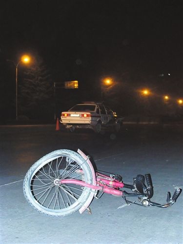 23時45分左右記者趕到事發(fā)現(xiàn)場時,幾名交警正在勘查現(xiàn)場;椟S的路燈下,公路中間躺著遇難者;幾米遠處,是那輛輪胎已經(jīng)變形的自行車;距自行車10米遠的地方,停著一輛右側(cè)前燈處有嚴(yán)重“撞傷”痕跡的警用普通桑塔納轎車,警車車牌為“川Z0189警”。