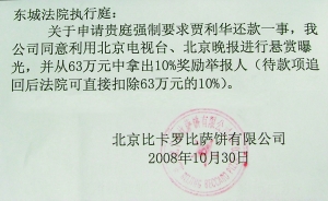 去年9月,賈利華被判返還北京比卡羅比薩餅有限公司借款63萬元。案件執(zhí)行時,法院經(jīng)合法傳喚,賈利華本人拒不到庭,只委托朋友來院了解案件。目前賈利華下落不明,法院依法對賈利華實(shí)施邊控限制其出境。北京比卡羅比薩餅有限公司現(xiàn)書面申請懸賞曝光,懸賞金為63萬元的10%。
