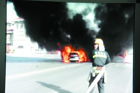 由于擔(dān)心車內(nèi)還有人被困,侯隊(duì)長立刻派3名隊(duì)員和一輛高噴車從不同角度滅火。5分鐘后火勢基本上被控制,消防隊(duì)員查看后發(fā)現(xiàn)車內(nèi)并無被困人員!靶目偹惴呕囟亲永锶チ恕!焙铌(duì)長說,七八分鐘后大火就被全部撲滅。