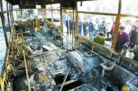 下午3時(shí)許,出事的白色奇瑞已被拖離現(xiàn)場,被燒壞的公交車趴在地上,外胎已被燒化粘在地上,車內(nèi)的坐椅、玻璃也在大火中全部燒化,整個(gè)車體只剩下一個(gè)框架!肮怨,鋼板都燒化了!币幻麌^者舉著兒子使勁往前湊。