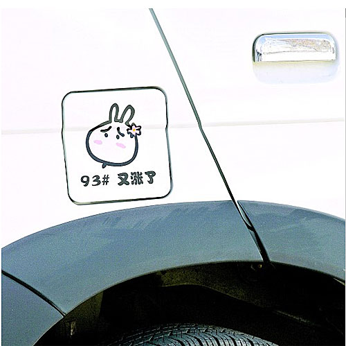 昨日,在西安北郊一停車場(chǎng)內(nèi),一輛車的油箱蓋上貼著卡通小人為汽油漲價(jià)而痛哭的表情,令過(guò)往觀者忍俊不禁。無(wú)獨(dú)有偶,在西安南二環(huán)路邊上,一輛車的油箱蓋上,小兔子也皺著眉頭,一行小字“93#又漲了”。