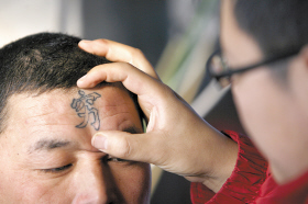文在哪呢?他想也沒想,指向了腦門。過了30分鐘,一個鏤空的、深藍色的“窮”字就出現(xiàn)他的腦門上了,這個字花了他30元錢。