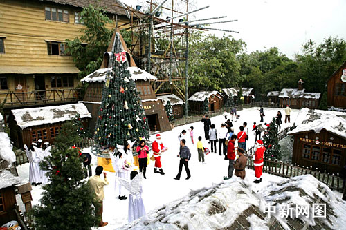 記者在廣東順德長鹿農(nóng)莊看到,這座山寨版圣誕老人村子上空正飄灑著晶瑩雪白的“雪花”,整個圣誕老人村銀裝索裹,不少游客和天使打扮的美女們正在村內(nèi)游玩,令人仿佛置身于北國雪域之中。