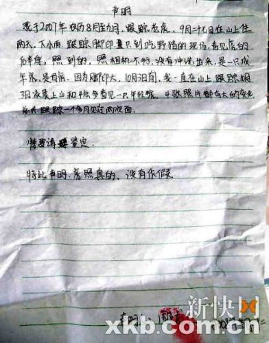新快報記者接到的這份“聲明”全文如下:“我于2007年農歷8月至九月,跟蹤老虎,9月二十七日在山上住兩天,下小雨,跟蹤腳印,只到吃野豬的現(xiàn)場,看見虎的后半身,照到的,照相機不行,沒有沖洗出來,是一只成年虎,是母虎,因為腳印大。10月3日前,我一直在山上,跟蹤10月3日凌晨上山和4點多看見一只年輕虎,4張照片都有大的變化,總共跟蹤一個月見過兩次面。特要請鑒定。特此聲明,虎照是真的,沒有作假。聲明人:周正龍。2008年冬月二十二”。