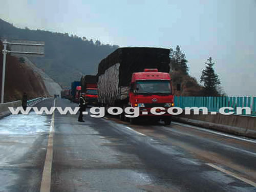 由于我。ㄙF州)貴遵、清黃、貴新、玉凱、貴開、水黃等高速(高等級)公路出現(xiàn)凝凍,為確保過往車輛安全,昨日凌晨至中午,這些公路相繼實行交通管制。直到下午14時,隨著氣溫回升,各條管制路段先后恢復(fù)正常交通秩序。