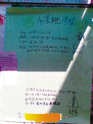 “太強(qiáng)悍了,圣誕節(jié)愛(ài)情宣言竟然貼到了我們女生宿舍的宣傳欄上!”江南大學(xué)一名女大學(xué)生向記者報(bào)料稱,該校北區(qū)女生宿舍樓下的宣傳欄里出現(xiàn)了一張張名為“水果攤情緣”的“很強(qiáng)大”的求愛(ài)海報(bào)。