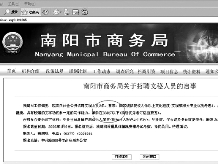 這不,南陽市商務局網(wǎng)站就有消息稱:商務局招聘兩名文秘,要求年齡不能超過330歲。