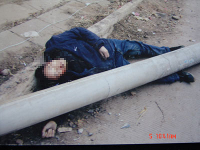 5日下午4時,汝州當(dāng)?shù)貧鉁氐陀诹阆?度。中國網(wǎng)通汝州分公司門外被駐足的市民團(tuán)團(tuán)圍住。一名自稱姓任(音),是網(wǎng)通公司警務(wù)室工作人員的中年男子叉腰站在門口臺階上。他的身后,死者魯偉政8歲的兒子魯志恒和剛滿一歲的妹妹依偎在媽媽懷里,驚恐而無助的望著他。一番爭論后,任姓男子緩緩點燃一根香煙,指著身后席地而坐的家屬大聲叫道:“你們這樣做是違法的!”“再吵把你們?nèi)テ饋!”任姓男子的說法立即引起圍觀群眾的強烈不滿,現(xiàn)場的爭吵聲將原本躺在媽媽懷中熟睡的女嬰嚇得大哭起來。