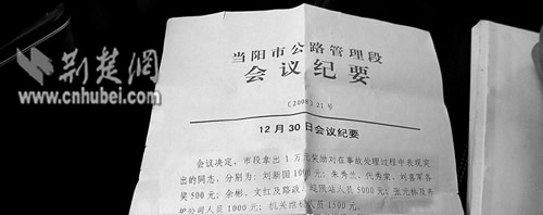 遺體火化當日,當陽市公路段召開月度工作會,以紅頭文件印發(fā)的《會議紀要》決定:拿出一萬元獎勵在事故處理過程中“表現(xiàn)突出”的同志,分別為:劉某1000元;朱某、代某、劉某各500元;余某、文某及路政、超限站人員5000元;張某及養(yǎng)護公司人員1000元;機關維穩(wěn)人員1500元。