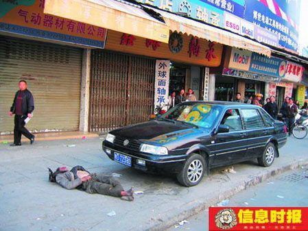 記者接報(bào)趕到現(xiàn)場(chǎng)看到,一輛黑色小轎車停在拐角處的人行道上,車底下躺著一名中年男子,年約40,蓬頭垢面,衣服破爛,光著臟兮兮的腳。他的臉上血跡斑斑,上衣拉到了胸口,倒在地上一動(dòng)不動(dòng),后來120急救車趕到,證實(shí)其已不治身亡。