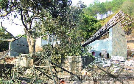 發(fā)生爆炸的私炮點位于譚禮村新寧隊后面的一個山坡上,民房離那里最近的只有約20米。在五六間磚木結(jié)構(gòu)的房子旁,一塊約100平方米的地面已漆黑一片,私炮點四周用水泥砌成的矮墻已全部崩塌,現(xiàn)場一片狼藉。