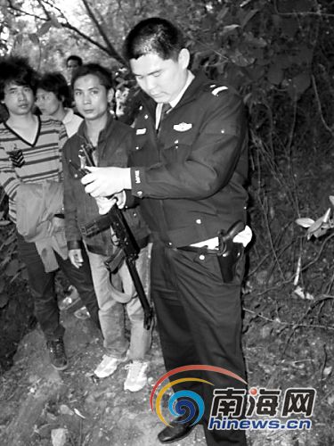 14點20分,為確認(rèn)山坡上的水牛是否被擊斃,一名民警前往山坡查看,為保證安全,這名民警挎上了一支沖鋒槍。