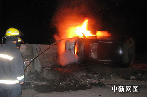 中新網(wǎng)瑞安1月24日電(記者袁爽 通訊員余根鈴)24日凌晨,在浙江瑞安市經(jīng)濟開發(fā)區(qū)濱江大道與東港路交叉口處發(fā)生了驚險的一幕。一個急轉(zhuǎn)彎,一輛北京現(xiàn)代越野車失控,撞上圍墻側(cè)翻并冒出滾滾濃煙,隨后冒出火苗,車子系統(tǒng)失靈,車門打不開,從天窗上爬出3男1女,攔下出租車,往醫(yī)院趕去。