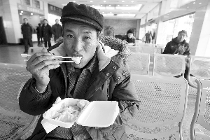 昨天11:00,記者來到中央門汽車站,站前廣場上空無一人。前天還像煮餃子一樣的候車大廳,只有稀稀拉拉的幾十個(gè)人。下午3:20左右,車站端出了為旅客精心準(zhǔn)備的“年夜飯”:一鍋餃子,共40碗分盛給站內(nèi)的每一位旅客。一位前往南通的老漢邊吃邊笑呵呵地說:“好吃,真好吃。”15:40,隨著南京到南通的最后一班車徐徐駛出,車站歸于了平靜。年前的春運(yùn)就這樣順利落幕了,沒有一名旅客滯留在車站。車站人士介紹,昨天一天的客流量約在5000人次,僅是24日的1/12。