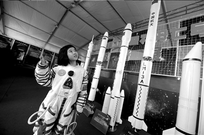 當(dāng)天下午,設(shè)在騰龍閣的航天科技體驗(yàn)場(chǎng)不斷有三五成群的游人進(jìn)出,神七返回艙的全尺寸模型、嫦娥一號(hào)的實(shí)物火箭殘骸、剛剛研制出來(lái)的長(zhǎng)征五號(hào)運(yùn)載火箭的微縮模型……站在只有在電視上能見(jiàn)得到的航空物品前,小朋友拉著爸爸媽媽問(wèn)個(gè)不停。旁邊,等待試穿宇航服的游客自發(fā)排起隊(duì),準(zhǔn)備過(guò)把“航天癮”。“神氣吧,快給我拍一張!焙蟻(lái)京務(wù)工人員張淼第一次逛廟會(huì),穿好宇航服后,他立即站到太空照片的背景前拍照留念。