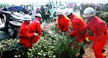 10多分鐘后,接警的消防戰(zhàn)士、解放軍163醫(yī)院的醫(yī)務(wù)人員、望城縣交警大隊的交警趕到了事故現(xiàn)場。消防戰(zhàn)士迅速用工具切割車體,將車內(nèi)傷員救出,醫(yī)務(wù)人員將傷員迅速送往醫(yī)院。由于節(jié)后返程的車輛大增,交通一度堵塞。交警迅速疏導交通,3名當?shù)氐闹伟碴爢T也馬上投入到搶救傷員之中,一臺從岳陽返回廣東的吉普車路過,見此情景,一名警察也跳下車來幫助疏導交通,當?shù)夭簧俅迕衽浜辖痪谑鹿尸F(xiàn)場設(shè)置警戒線……車禍現(xiàn)場雖然慘烈,但軍警民生死大營救有條不紊地進行。