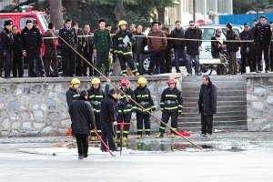 事發(fā)現場,吞噬了年輕男子的冰窟緊靠敬業(yè)湖南岸。公安、消防人員將敬業(yè)湖緊鄰北洋道一側的湖岸封鎖,7個民警沿著親水平臺走上冰面,用竹竿在冰下摸索著。時間一分一秒地過去,救援人員找來一塊長方形木板,當作筏子艱難地破冰搜救。一個半小時過去了,救人的“筏子”漸漸向湖心移動,搜索的竹竿在一米一米地加長,但水下沒有一點動靜。