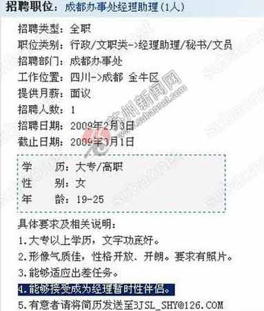 2月3日下午,成都招聘網(wǎng)上一條招聘信息讓網(wǎng)友驚詫不已,這是北京某科技公司成都辦事處招聘一名經(jīng)理助理,要求女性,大專、高職即可,年齡在19至25歲,以及其他一些常規(guī)招聘要求。隨后在“具體要求和相關(guān)說(shuō)明”一欄中,有兩條要求別出心裁,是眾多求職網(wǎng)友從沒(méi)見(jiàn)過(guò)的。第二條:形象氣質(zhì)佳,性格開(kāi)放、開(kāi)朗。要求有照片;第四條:能夠接受成為經(jīng)理暫時(shí)性伴侶。招聘信息中還留有招聘單位的聯(lián)系人、電話和郵箱。