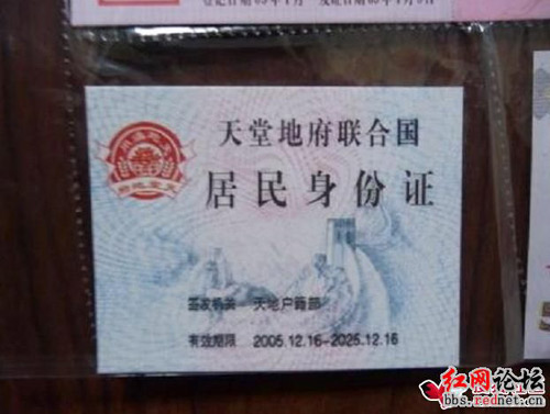 最“雷人”的是冥幣上印制的內(nèi)容!其中“天堂地府聯(lián)合國(guó)居民身份證”,發(fā)證機(jī)關(guān)是天地戶(hù)籍部,最有“創(chuàng)意”的要屬其“國(guó)徽”了,上面印有國(guó)名“天堂地府”,還有“天地通用”四個(gè)字樣。而神通廣大的“天地通用”的紙幣,發(fā)行銀行是“天地銀行有限公司”,上面的圖案是傳說(shuō)中的玉皇大帝。