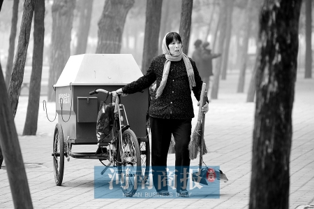 梁廣英說的是她的月工資。她在鄭州城西的碧沙崗公園做清潔工,已經(jīng)有兩個(gè)月時(shí)間。不過,她不直接受雇于公園管理處,每月250元的工資,是由公園一名姓趙的清潔工給她開的。她幫他干活。