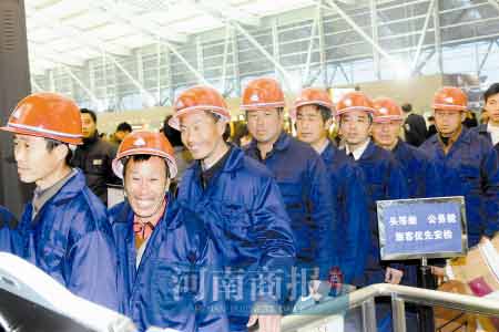 鄭州新鄭機場候機廳昨日來了一群身穿工作服、頭戴安全帽的農民工,但是,他們不是來這里改造候機樓的,而是要坐飛機去海南打工。