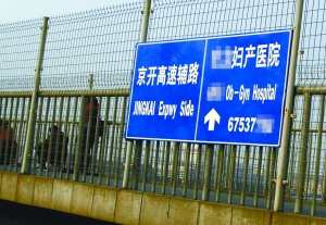 時先生所指的指路牌有四塊。其中一塊懸掛在新發(fā)地長途客運站門前的過街天橋南側(cè)護欄上,正下方為進京方向輔路。這塊藍底白字的牌子上,并排印著京開高速輔路和某家婦產(chǎn)醫(yī)院的字樣,旁邊還有相應的英文和箭頭指明方向,并留有醫(yī)院電話。
