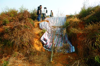 當(dāng)?shù)匾恍┐迕褚仓肋@起發(fā)生于2008年底的盜墓案件。不過,古墓究竟是什么樣子?墓中出土了什么器物?村民們都不甚了解。一位村民說:“當(dāng)時公安局和文物局的人都來了,他們在墓邊上挖了很多土溝,還發(fā)現(xiàn)了一塊絲綢呢。”另一位村民描繪說,絲綢底色呈綠色,上面繡有一只鳳凰,“鳳凰好像是黃色的。”
