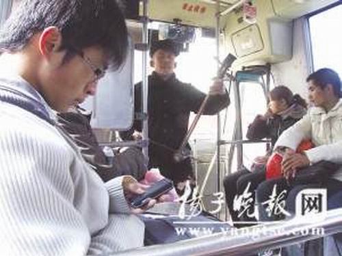 昨天下午1點(diǎn)多,在南京至浦口的一輛公交車上,車廂里突然飄蕩出胡琴聲,并伴隨著一陣蒼老的歌聲,引得車廂里乘客側(cè)目相看。這名唱歌者是一名老漢,年過六旬,一邊拉二胡,一邊唱歌。唱完幾首歌曲后,這名頗像流浪歌手的老漢,摘下頭上戴著的帽子,挨個(gè)座位向乘客收錢。有不少乘客解囊,掏出一兩塊硬幣投進(jìn)他的帽子里,也有乘客沒有理會,不愿意給錢。穿著整齊干凈的老漢,到乘客跟前討錢的時(shí)候,態(tài)度比較有禮貌,并沒有死纏硬磨乘客,在車上的15分鐘內(nèi),老漢演唱了3首歌,“賺”了20多元。