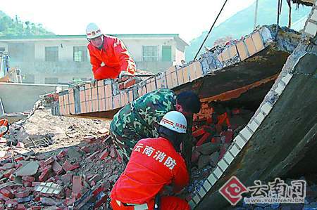 據(jù)介紹,當日12時12分,羅平消防大隊接到縣指揮中心指令稱:阿魯鄉(xiāng)樂戈必小學的一所兩層樓的危房倒塌,兩名群眾被埋,生死不明,情況十分緊急,請求救助。消防大隊立即成立救援指揮部,下設偵查、警戒、保障、戰(zhàn)斗等4個救援小組,迅速出動1車5名消防官兵火速趕赴事故現(xiàn)場。