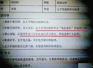 該網(wǎng)友在帖子中展示了她公司最近收到的一份求職簡(jiǎn)歷的圖片。圖片顯示,求職的是一名來自鄭州大學(xué)的本科女生,專業(yè)是電子信息科學(xué)與技術(shù)。其中,最“雷人”的一部分在其自我評(píng)價(jià)一欄:“在大學(xué)期間被推舉為“宿舍舍長(zhǎng)”并連任三年;細(xì)心謹(jǐn)慎,在鄭州生活三年多從來沒丟過錢包、手機(jī)或者個(gè)人證件!