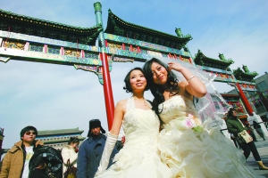昨日13時許,前門大街正陽門牌樓下,身著禮服的男同性戀小張在攝影師的安排下抱起了身邊的愛人,深情相吻。一旁的女同性戀小韓與愛人著白色婚紗,正在尋找合適的拍攝地點。過往的游客被這兩對特殊愛人吸引。