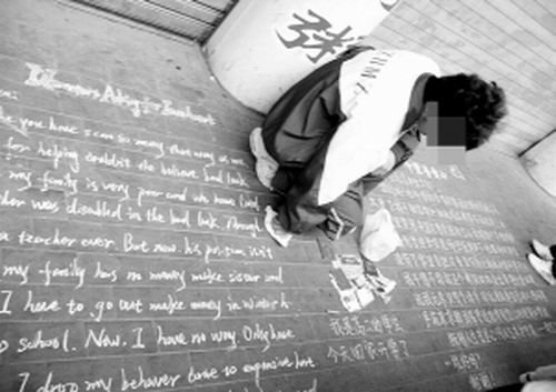 男孩的面前擺放著幾本“證件”和幾張零散的紙幣,在證件的前邊用藍(lán)色的粉筆寫著:“我是高二的學(xué)生,今天回家開學(xué)了!痹诘匕迳,他還用中文和英文兩種語言寫了“千里尋愛心”的求助信。