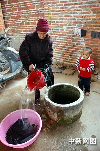 或許是怕我們不相信,一直靜靜地坐在一邊聽我們談話的老人站起來,拿著一個紅色的塑料桶來到前院的井邊提了兩桶水,倒在一旁的盆里自顧洗起衣服來。井很深,桶雖不是很大,但一桶水起碼也有近十斤,若非親眼所見,實難相信一位百歲以上的老人能如此輕松自如地提上來。