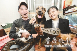 王啟懷老兩口沒有和孩子們住在一起。據(jù)了解,除了緬甸蟒外,老兩口還養(yǎng)了鷹、猴、八哥甚至青蛙等寵物,雖然寵物們每個月的直接伙食費都在300元以上,但他們卻其樂無窮,“你對它好,它就對你好。你沒有理由不善待它們!(本欄稿件由 首席記者 黃艷春 實習生 楊雪婷 采寫)