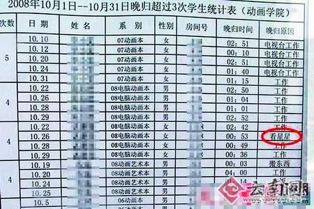 近日,北影校園內(nèi)張榜公布了各系晚歸宿舍的學(xué)生名單,有意思的是,學(xué)校竟然還把超過3次晚歸的詳細(xì)原因都公布了出來。昨天,有好事網(wǎng)友將這些名單傳到了網(wǎng)上。據(jù)記者觀察,學(xué)生們晚歸的理由五花八門,有“電視臺工作”、“吃飯”,也有“拍戲”、“回家”,而動畫學(xué)院一位女生的理由竟然是“看星星”。“晚歸表格”一時間被無數(shù)網(wǎng)站轉(zhuǎn)載,點(diǎn)擊率一路攀升,而廣大網(wǎng)友的評論似乎也并不客氣。因?yàn)楸庇笆撬囆g(shù)院校,加上娛樂圈給人的感覺是魚龍混雜,很多人的矛頭直指藝術(shù)院校學(xué)生的素質(zhì)。