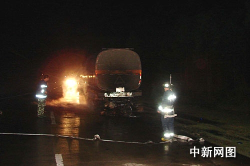 欽州消防隊(duì)10名官兵聞警迅速出動(dòng)。事發(fā)現(xiàn)場(chǎng),一輛車牌號(hào)為粵G的油罐車后輪胎已全部著火,一輛摩托車在大火中熊熊燃燒,油罐車車主已不見(jiàn)蹤影。