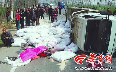 記者在現(xiàn)場看到,一輛車號為陜A17243的小貨車側(cè)翻在馬路北邊,車窗玻璃全部破碎,車上拉的麩皮撒落二三十米?拷R路邊的一塊破布下,身穿紅色褲子的王維維壓在自行車下。
