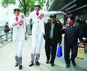 提起這兩個(gè)小伙子,南京市民可能并不陌生。2米26的那個(gè)叫張夢(mèng)永,2米12的叫秦為超,快報(bào)曾經(jīng)報(bào)道過他倆的“雙塔組合”。昨天下午兩點(diǎn),兩“巨人”出現(xiàn)在山西路上,穿著定制的白色禮服,戴著高高的白色禮帽,再配上酷酷的墨鏡,所經(jīng)之處立刻被圍得水泄不通。“哇,你有姚明高么?”“你們的腿是真的假的啊?”“這么大腳,是真的么?”圍觀的市民們提出千奇百怪的問題,兩個(gè)小伙子耐心地一一解答。