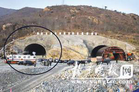 昨天下午4點左右,記者趕到現(xiàn)場?吹讲粫r地有車輛進出隧道口,數(shù)十名戴安全帽的工作人員焦急不安地來回穿梭。工地外邊的一條水泥路上,幾名施工人員拎著幾個紅色的塑料袋,記者發(fā)現(xiàn)里面裝著鞭炮和紙錢,據(jù)其中一名工人介紹,他是貴州人,這是燒給兩名遇難老鄉(xiāng)的。