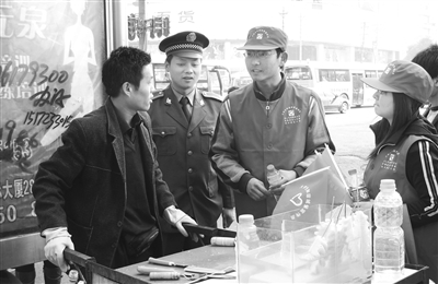 昨日首次“上崗”2小時,這群大學生“城管”共勸阻占道經營、流動攤販17處,清除“三亂”牛皮癬34處。(記者 夏瓊 通訊員 葉火生 李梅)(記者 蔡曉智 通訊員 李梅 攝)