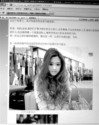 3月16日凌晨2點57分,“北外香水女生”發(fā)表題為《媽媽:我被北外強制退學了》的文章。該文稱,德語系劉老師找她談話,說她的博客直接攻擊教育部,給學校領導造成很大的壓力,催她寫退學申請。校方要求其家長迅速抵京辦理手續(xù)。