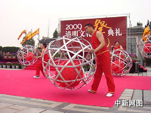 震撼的鐘鼓聲,以象征中華民族傳統(tǒng)中最高禮數(shù)的數(shù)字拉開文化祭祀的序幕;清婉的樂(lè)聲中,配以渾厚的嗓音朗誦祭文,表演滾燈的八名小伙則身著紅色演出服手持近一人高的滾燈登場(chǎng)。最令人意外的是,紅色成為這場(chǎng)祭祀的主打色彩——紅毯、紅漆大鼓、紅色的滾燈,表演者的頸上也都戴著一條絳紅色的圍巾,現(xiàn)場(chǎng)形成了一股中國(guó)民俗濃烈的傳統(tǒng)文化氣氛。