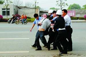 據(jù)陳勇介紹,昨日下午4時(shí),他正在中南大學(xué)新址的拆遷現(xiàn)場(chǎng)采訪。當(dāng)時(shí),有拆遷戶(hù)拉著橫幅,與數(shù)十名身著城管和聯(lián)防制服的男子對(duì)峙。“剛開(kāi)始還算平靜”,不多時(shí),五六名穿制服者圍毆一名拆遷戶(hù)。