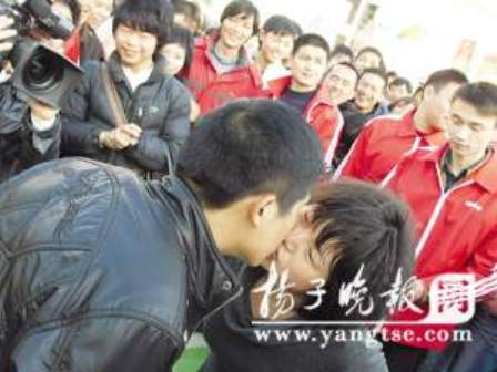當(dāng)天下午,一商家為了推銷新開發(fā)的果汁飲品產(chǎn)品,在宿遷市區(qū)舉辦一場“KISS我最!钡慕游谴筚惢顒印4筚愐(guī)定,參賽雙方接吻時必須雙手背在身后,單腿站立,嘴唇吻在一起,誰的時間長誰就是冠軍。獲得冠軍的將當(dāng)場獲得2009元現(xiàn)金,亞軍將獲得1001元現(xiàn)金,季軍也有520元的獎金。