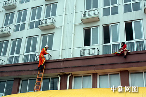 接警后的消防官兵迅速到場(chǎng),指揮員立即下令對(duì)事故現(xiàn)場(chǎng)進(jìn)行警戒隔離,維持現(xiàn)場(chǎng)秩序,防止圍觀人員起哄,影響救援工作;同時(shí)在輕生者所站位置下方迅速鋪設(shè)救生氣墊,防止意外情況發(fā)生;同時(shí)由指揮員帶領(lǐng)1名官兵到二層窗外露臺(tái)上進(jìn)行營(yíng)救。