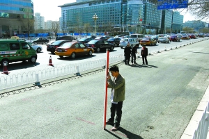 昨日12時許,西單文化廣場前的長安街非機動車道兩頭出入口,已經(jīng)被拉上警戒線,交警及協(xié)管員指揮過往非機動車,由廣場人行道繞行。警戒線內(nèi),非機動車道上一面積近40平方米的路面輕微凹陷,形成一個明顯但弧度不大的低洼處。柏油路面上,工作人員用噴漆標記了沉降范圍,以及需要進行勘測的監(jiān)測點。